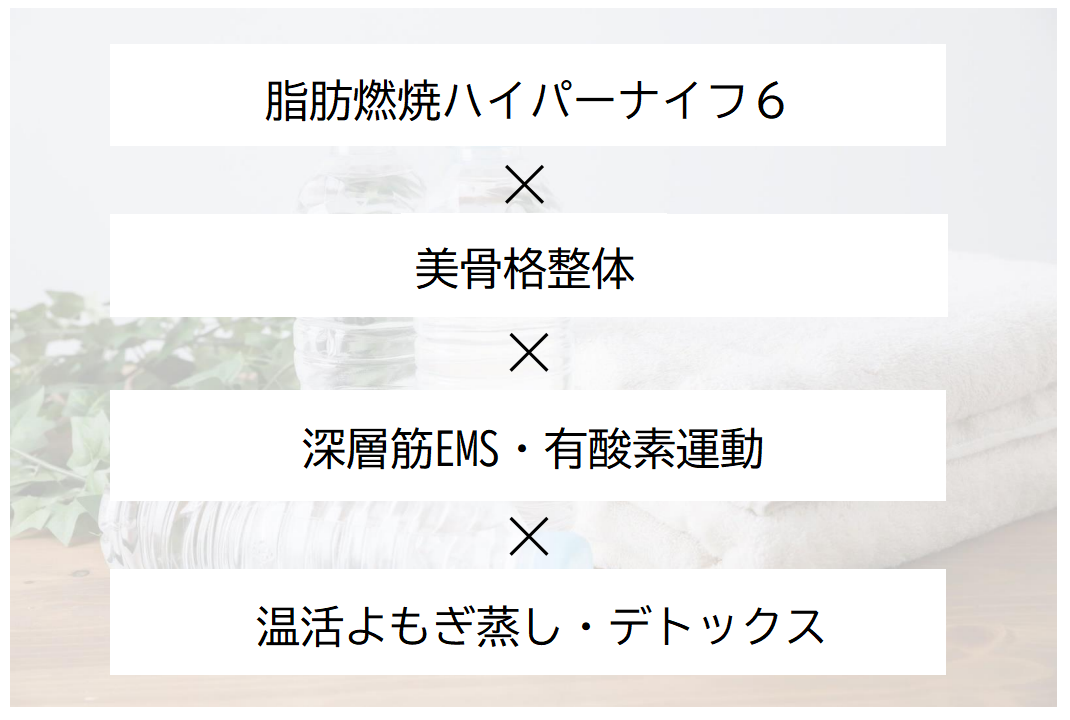 痩身に必要な、脂肪の分解・排出促進を『高周波痩身器新型ハイパーナイフ6』で行い、ご希望のお客様には『深層筋EMS』で気になる箇所を中心に筋肉を刺激してスリムに引き締めます。 - 効果を高める独自技術のリンパケア・老廃物排出を促す揉みだし施術は大変人気です。誰にも会わない【個室ジム】もご利用いただけます。