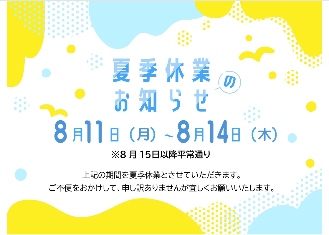 夏季休業のお知らせ いつもBEBIQUOをご愛顧いただき誠にありがとうございます。 夏季休業のお知らせです 2025年8月11日~8月14日 上記の期間を休業とさせていただきます。 ご不便をお掛けしますが、何卒ご了承の程お願い申し上げます。