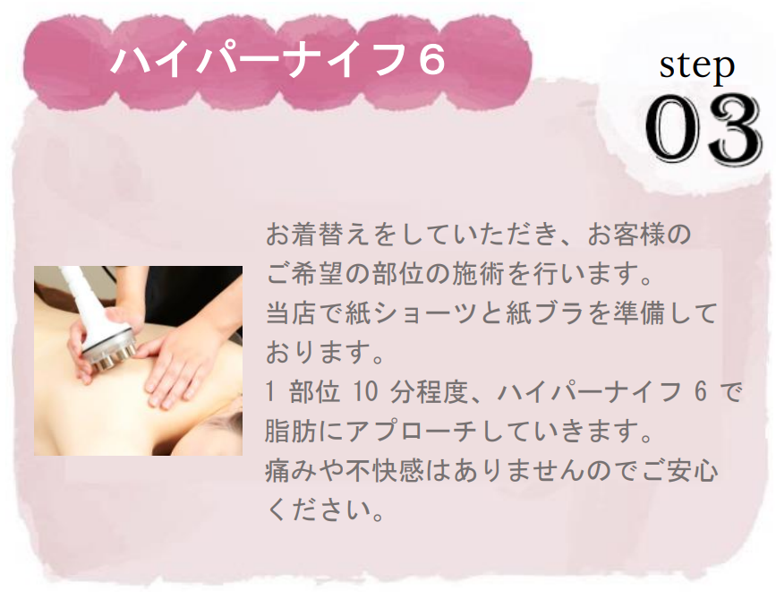 - 当店はハイパーナイフを施術しながら、同時に骨盤調整も行いますので時間もかからず効率的です。