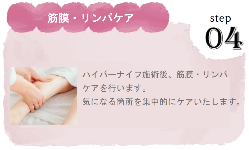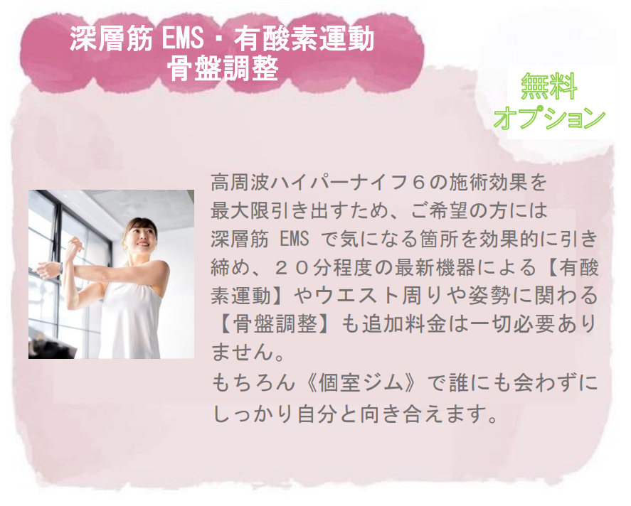 - 気になる部分には『新型ハイパーナイフ6』で集中的に部分痩せ、同時に『筋膜・リンパケア』で、むくみ・引き締めを行い、小顔ケア・デコルテ施術でスッキリ、全身管理は『有酸素運動』・『骨盤調整』で姿勢矯正も◎
