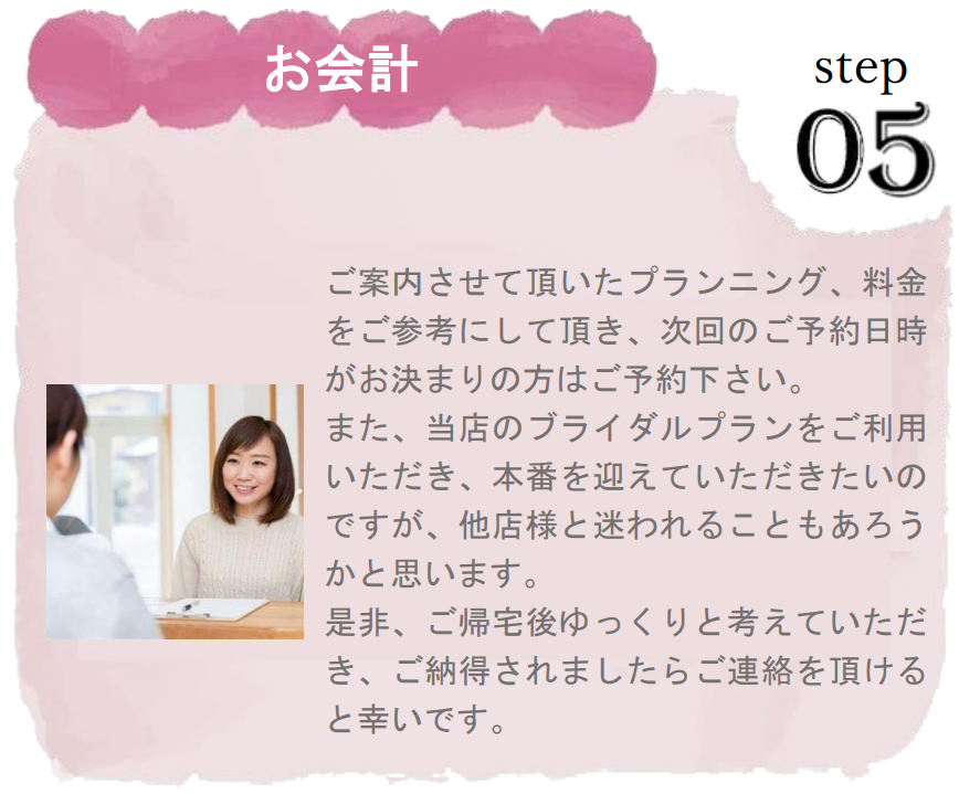 - ウェディングドレスで強調されるデコルテとセットでフェイシャルを専門スタッフによりお受けいただけます。