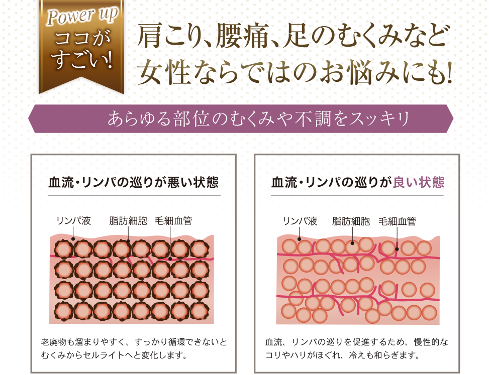 身体を温めることにより、血管が拡張されて、血流やリンパの流れが促進されることで肩こりや腰痛、冷え性、むくみのような辛い女性のお悩みに的確にアプローチいたします。