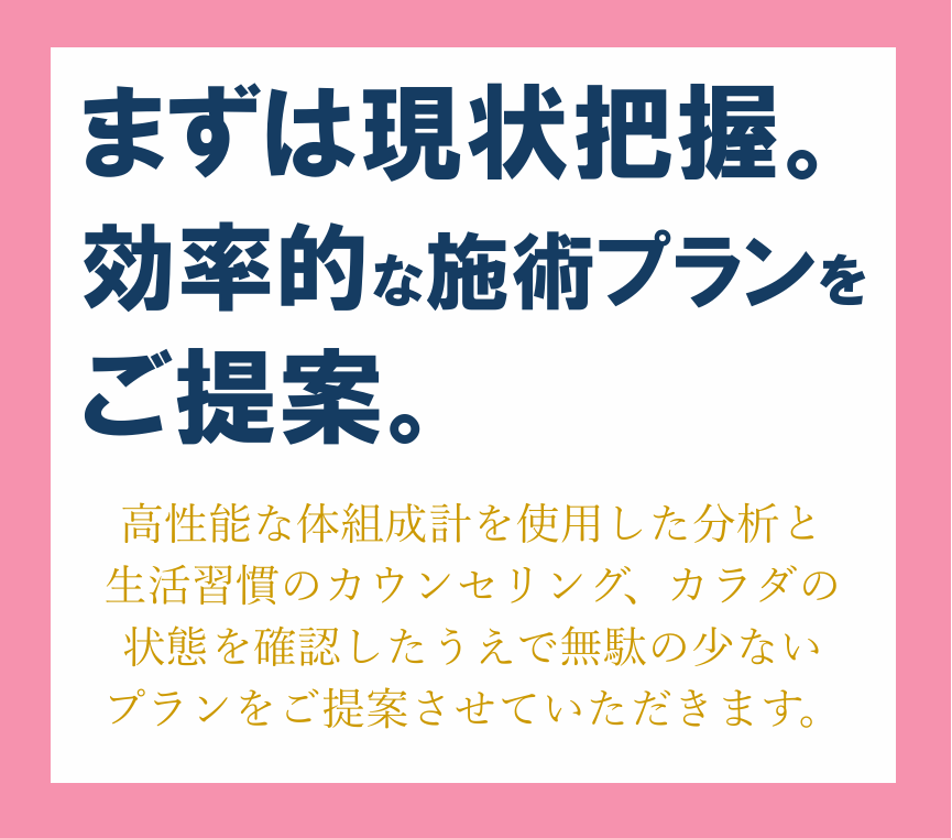 測定データやカウンセリング、実際にお身体の状態を確認することで無駄の少ない「オーダーメイド」のプランをご提案させていただきます。