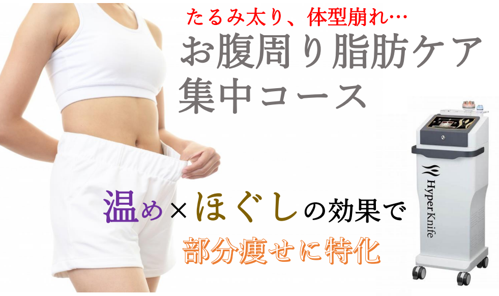 何とかウエストを引き締めて、ぽっこりお腹、前に出たお腹、ずん胴ウェストに、高周波の温熱作用と特殊ハンドピースによる『温め×ほぐし』のダブル効果で皮下脂肪を分解を助け、独自技術のリンパケア・老廃物排出を促す+揉みだし施術でほっそりお腹とウエストくびれに☆
