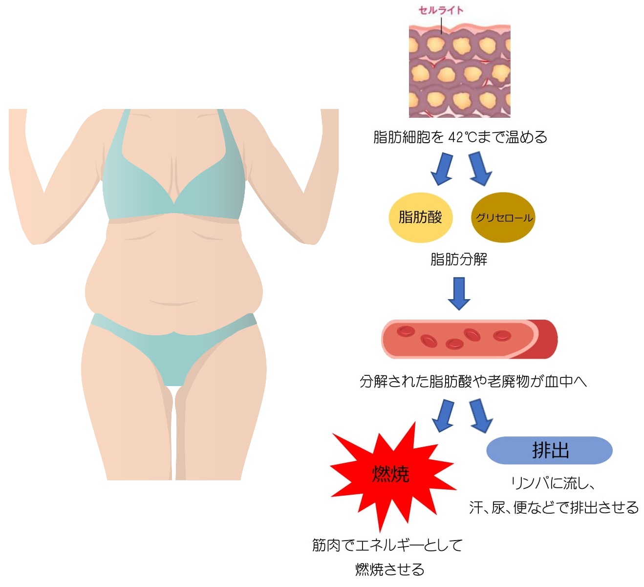 皮下4.5cm前後を42℃で身体を温めることにより、表面だけでなく、深い所の脂肪にも燃焼を促し、血管が拡張されることにより、血流やリンパの流れが促進されることで肩こりや腰痛、冷え性、むくみのような女性のお悩みに的確にもアプローチ。