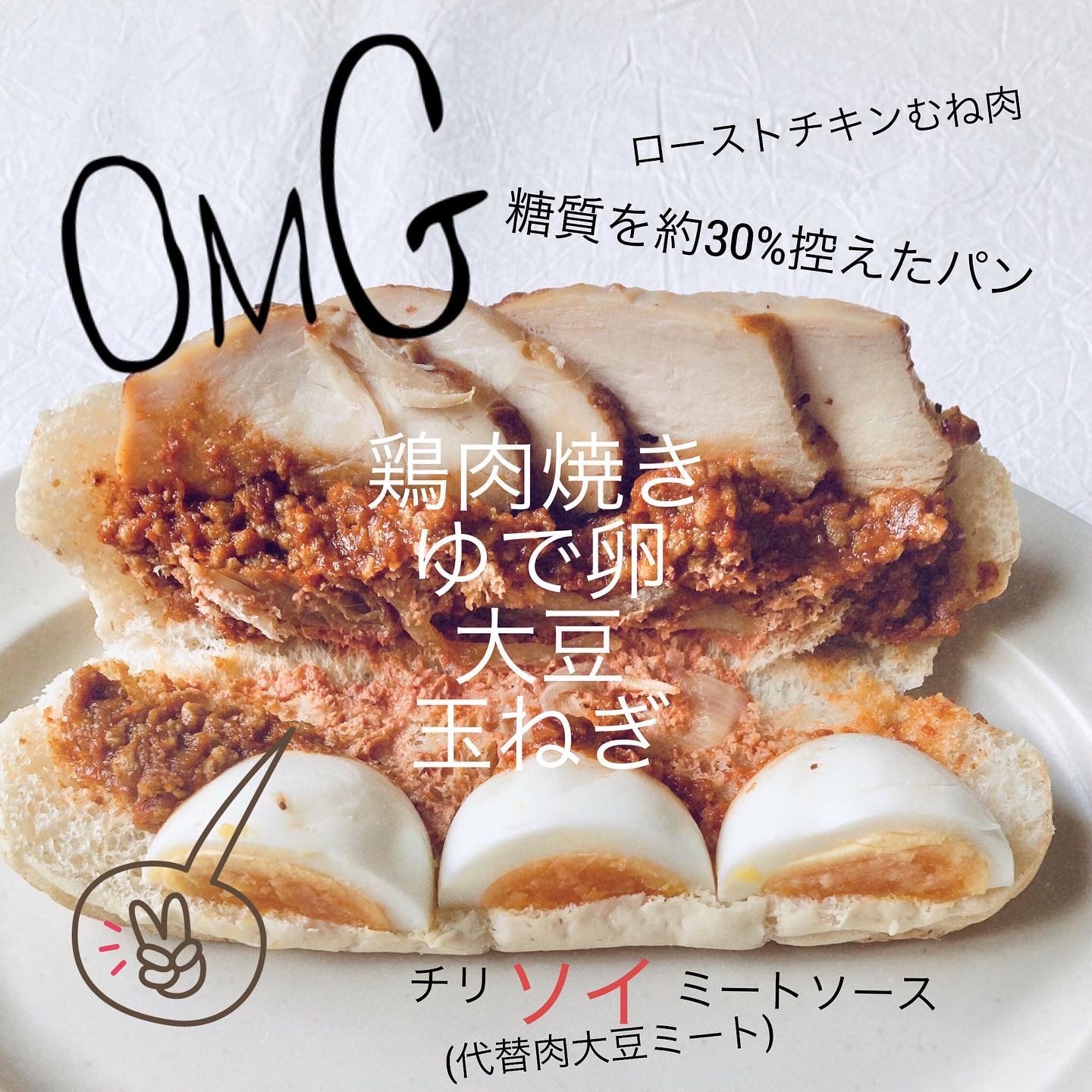 チキンも卵も、さらにチリソイミートソースはお肉ではなく代替肉の大豆がつかわれています